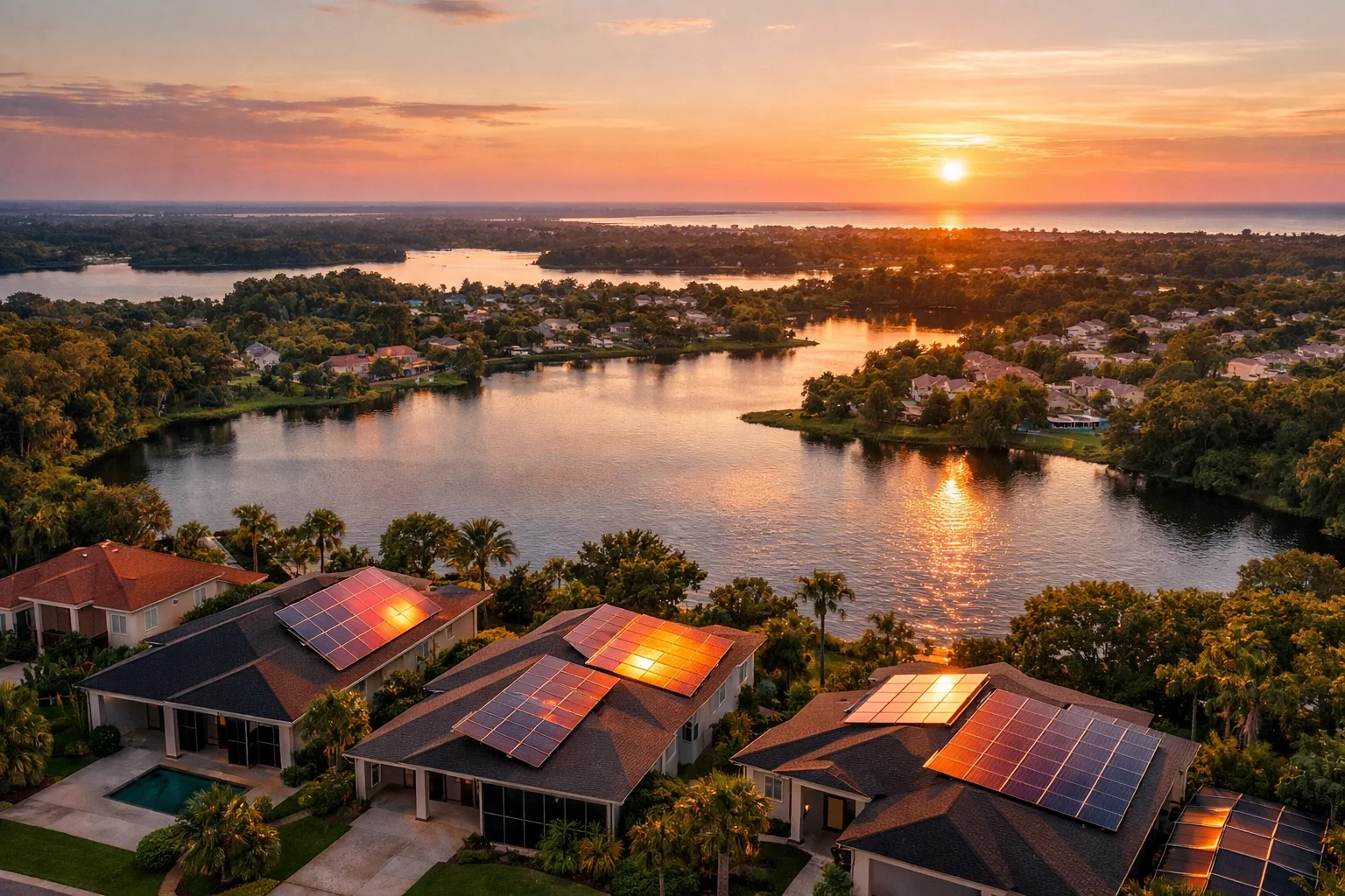 Aerial view of a Central Florida neighborhood showcasing homes with solar panel systems near local lakes.